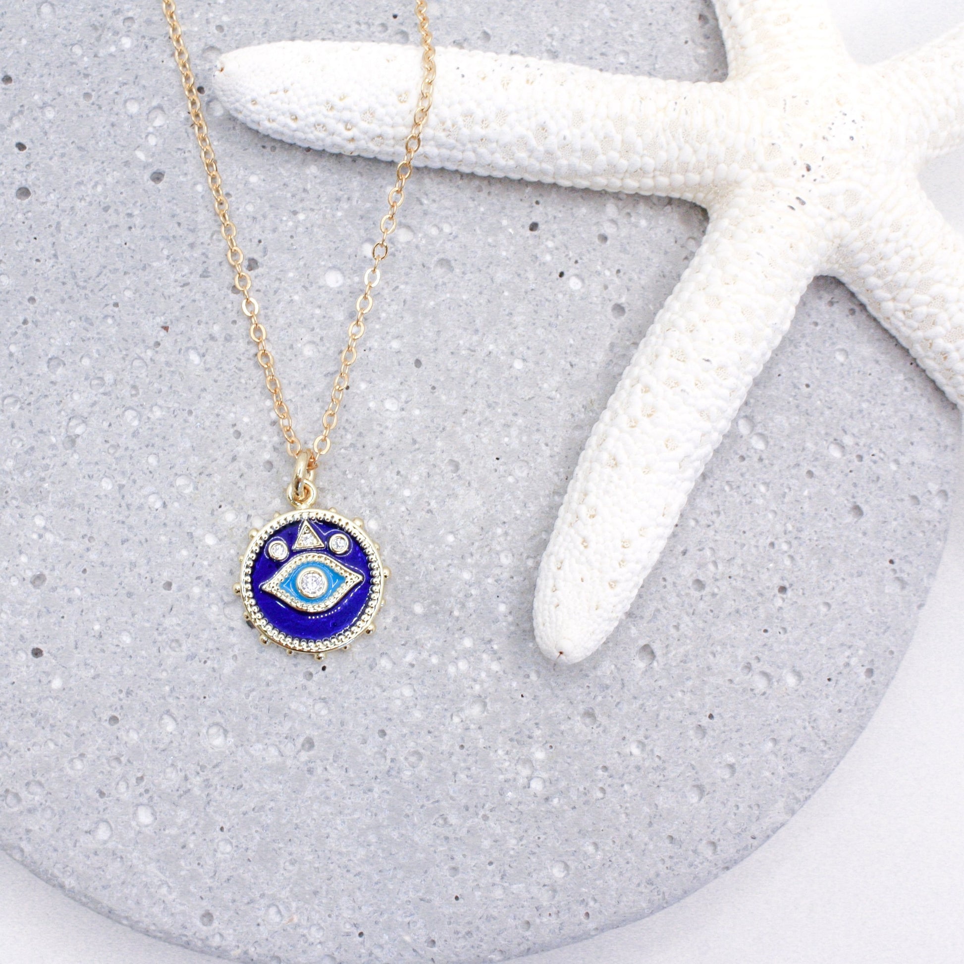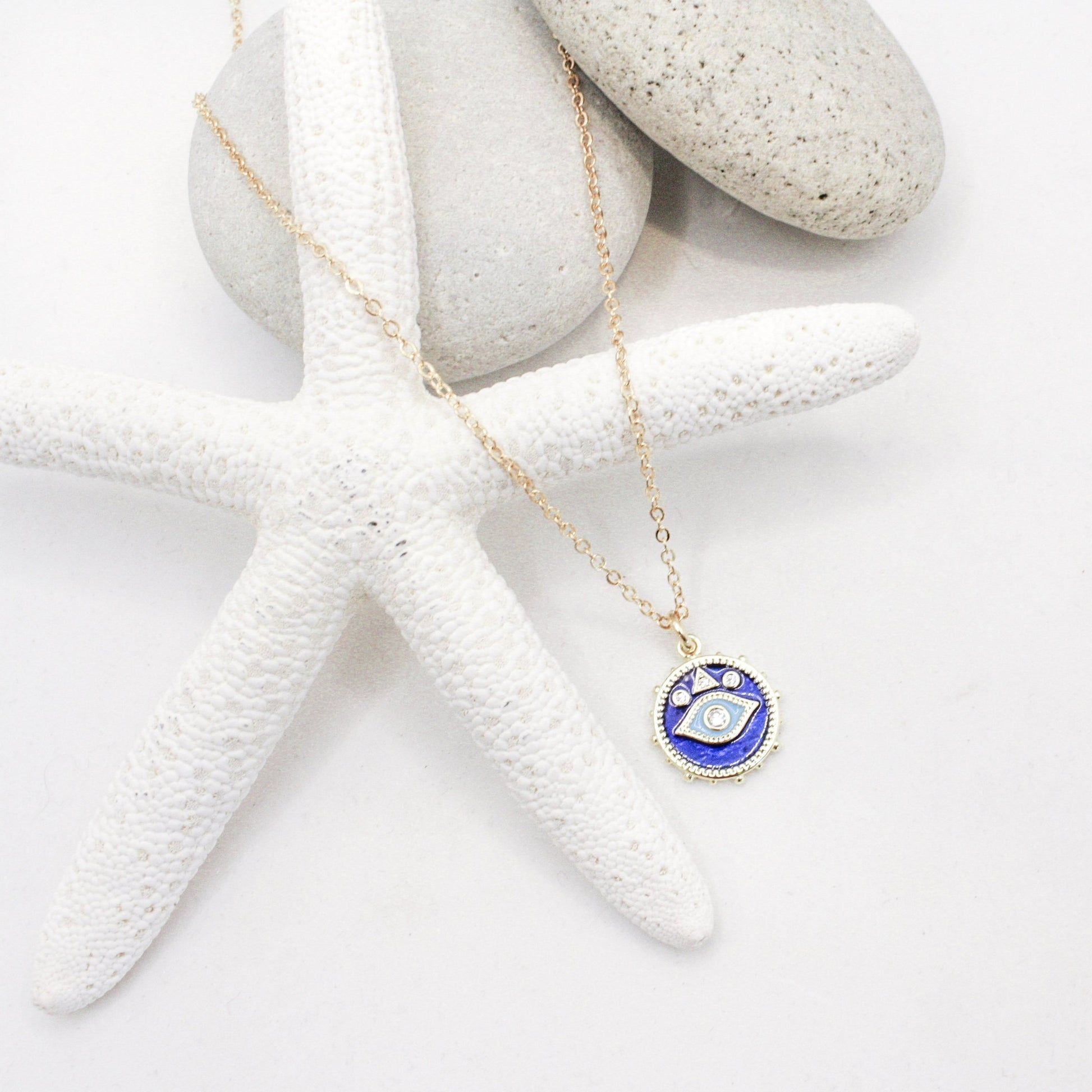 Invite good fortune and radiant energy. The Evil Eye Charm Necklace - crafted in glossy cobalt enamel and accented with sparkling cubic zirconia - transforms a timeless symbol of protection into a luminous, resort-ready statement that layers beautifully with every look.