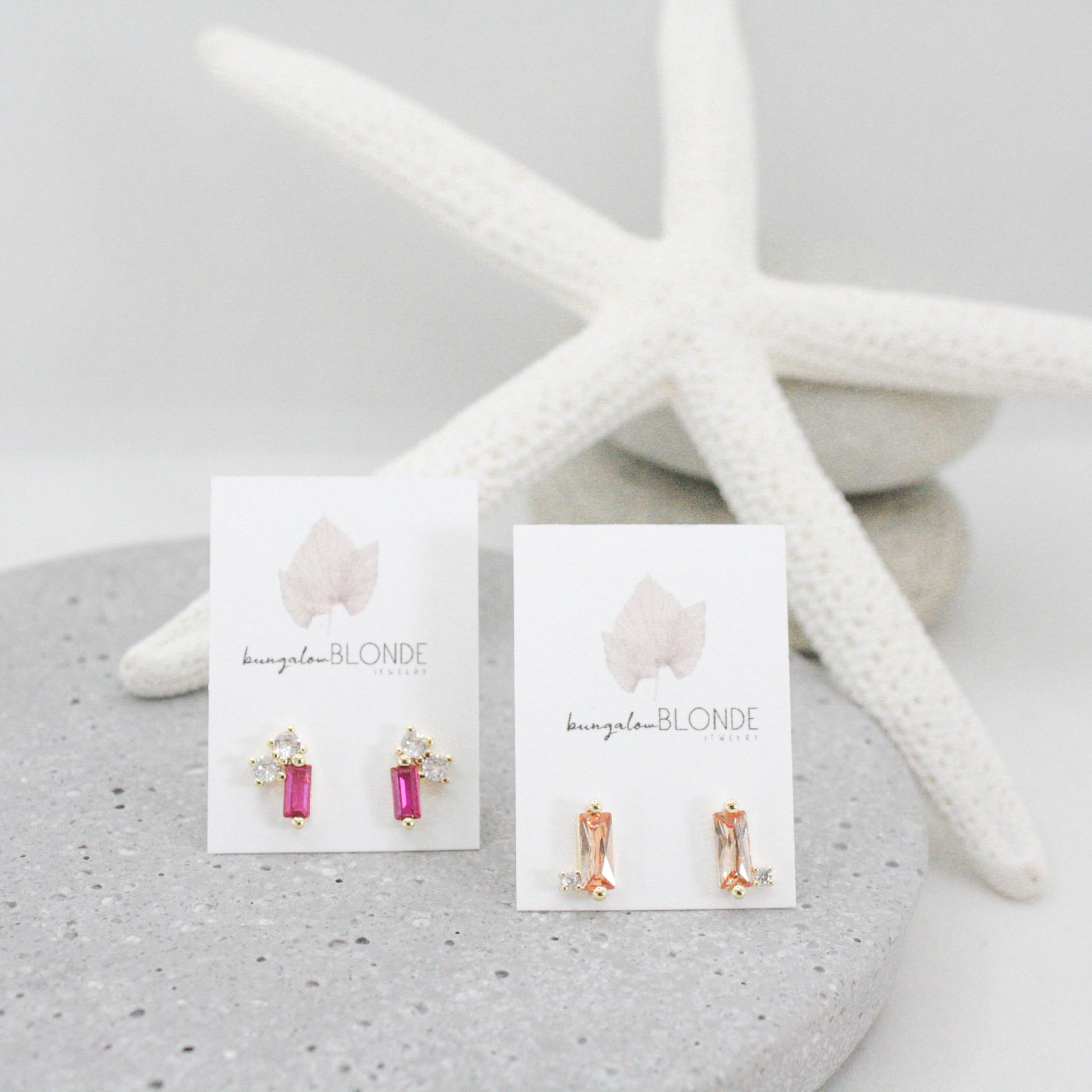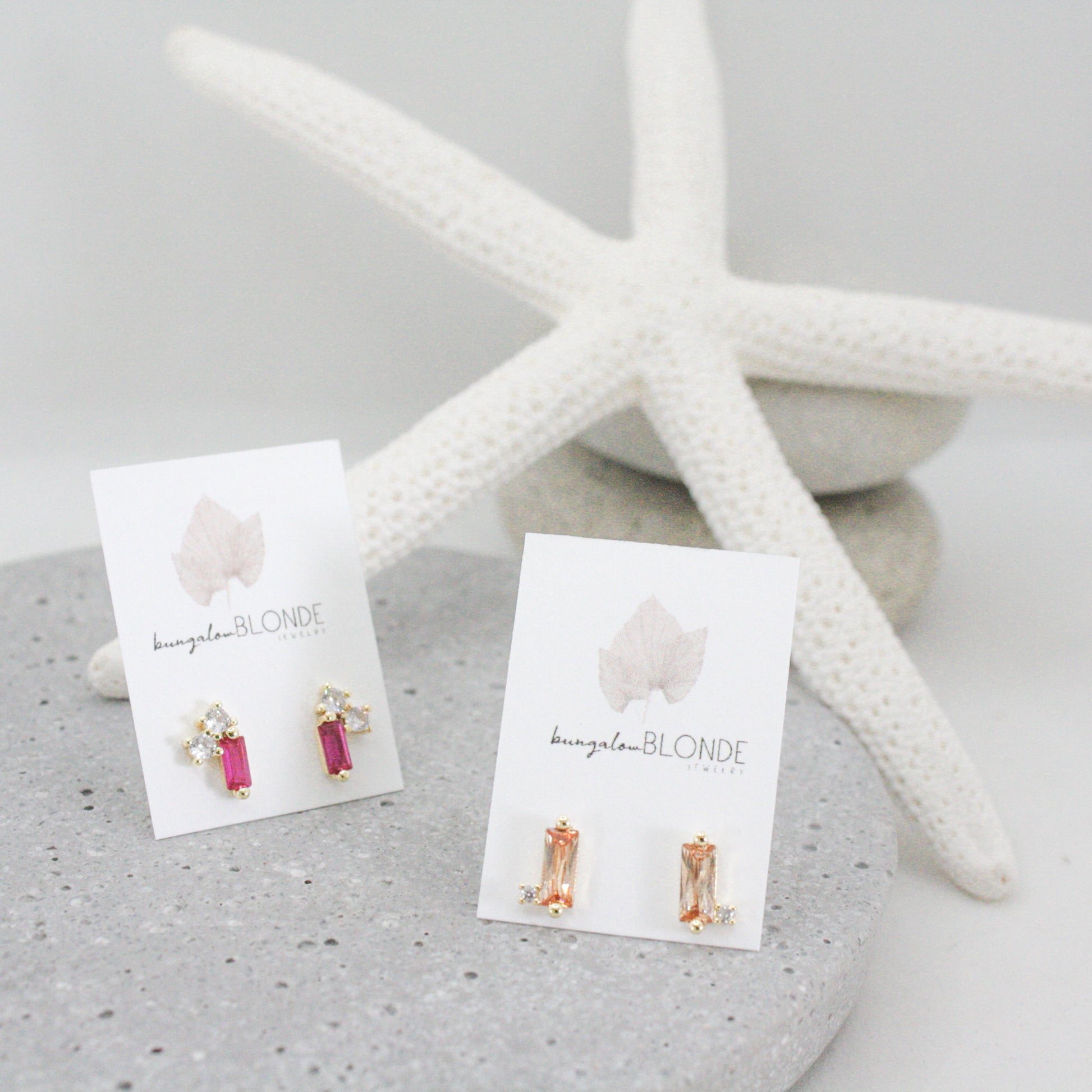 Introducing our stunning dainty Le Petites baguette style stud earrings. These earrings are the perfect combination of elegance and simplicity, adding a touch of glamour to any outfit. The baguette shape of the stones gives these earrings a unique and stylish look, while their delicate size makes them perfect for everyday wear.