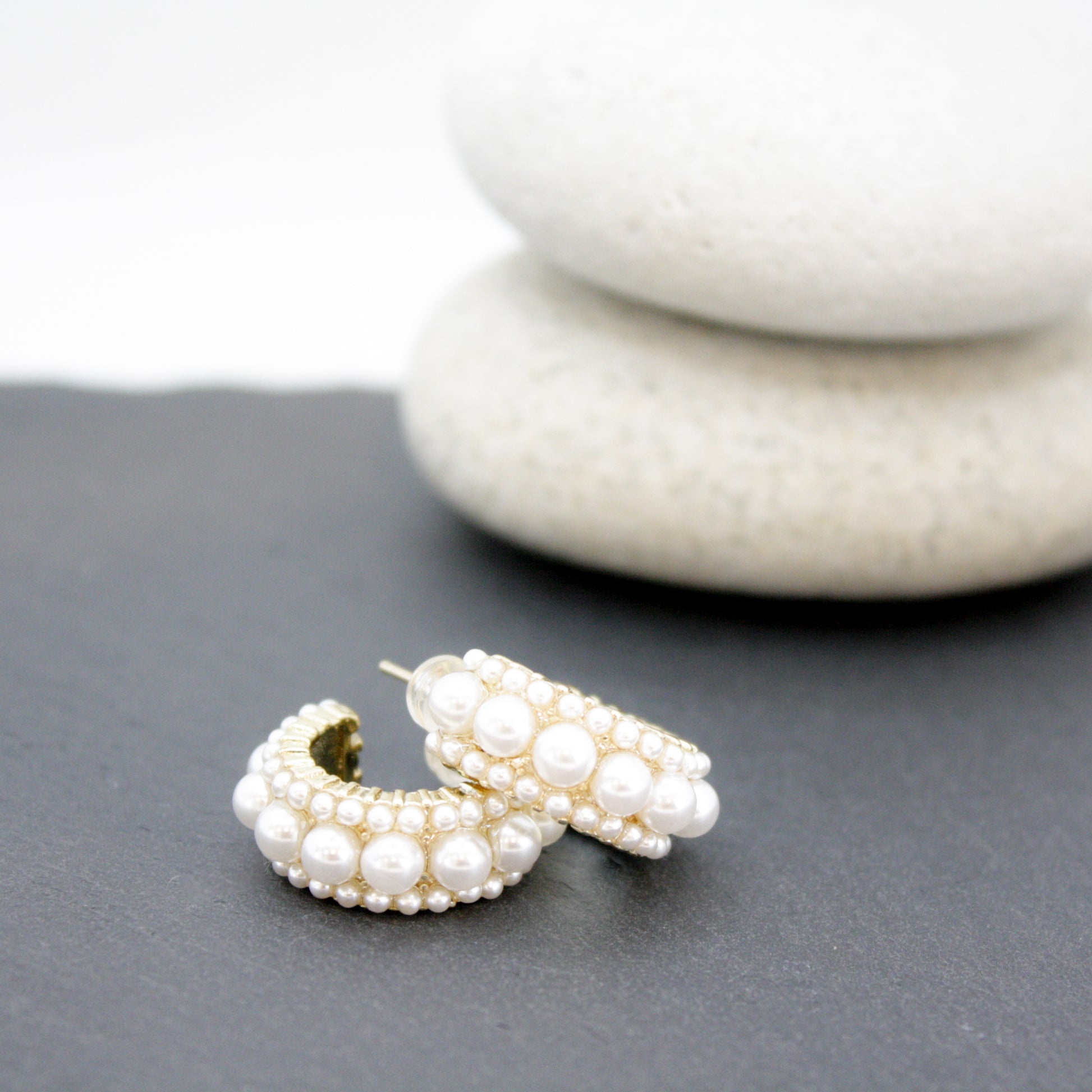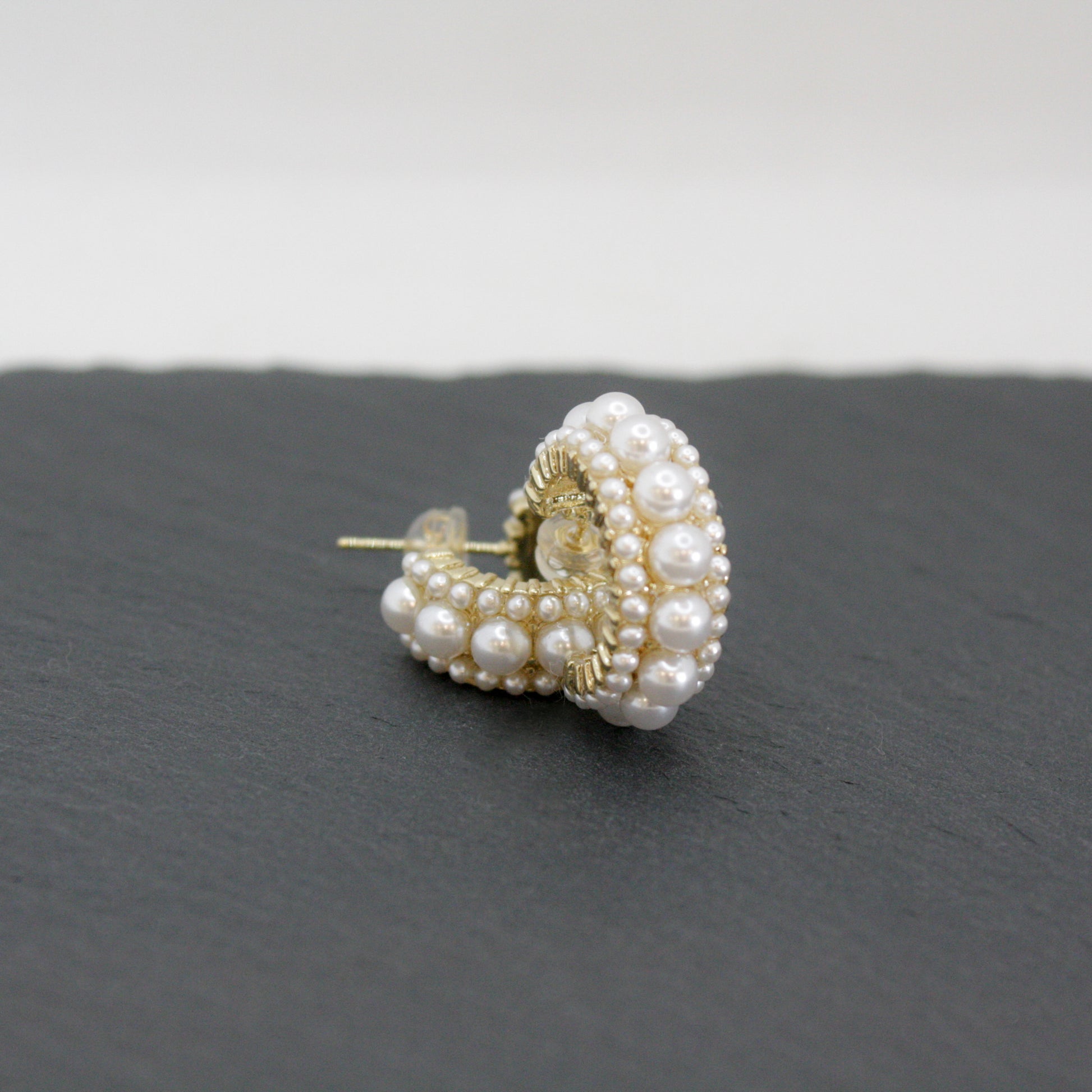 Our 14k gold-filled Lenah Hoop Earrings feature a stunning cluster of pearls in various sizes. These earrings are a true work of art, showcasing the natural beauty of pearls in an eye-catching and unique way. The combination of large and small pearls creates a dynamic look that catches the light and draws attention.