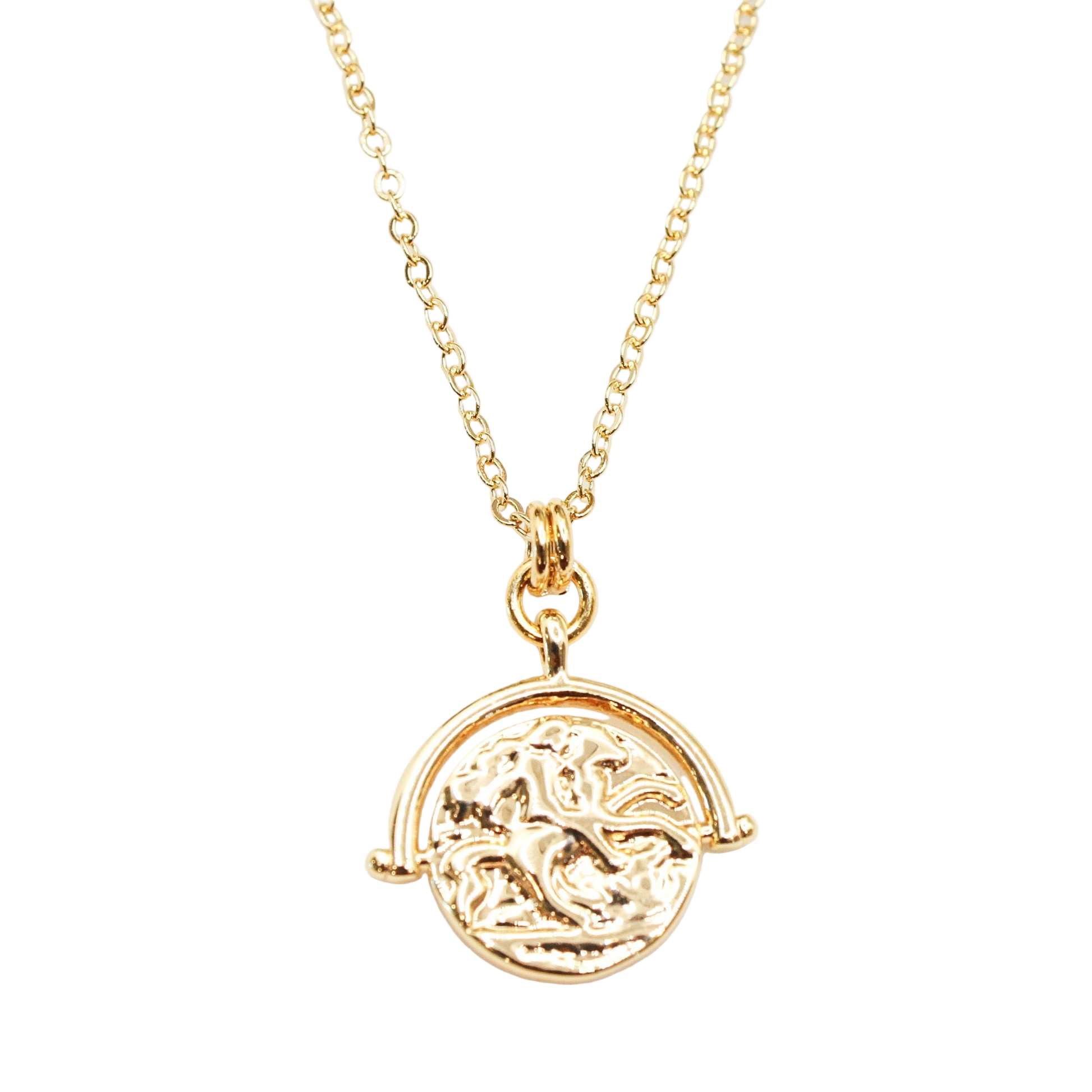 Stamped with a rider on horseback, this pendant feels like it could have been unearthed on a sun-drenched island - a little relic of freedom, movement, and adventure. Layer it with your gold chains for that just-back-from-paradise glow, or wear it solo when you want one piece to do all the talking.