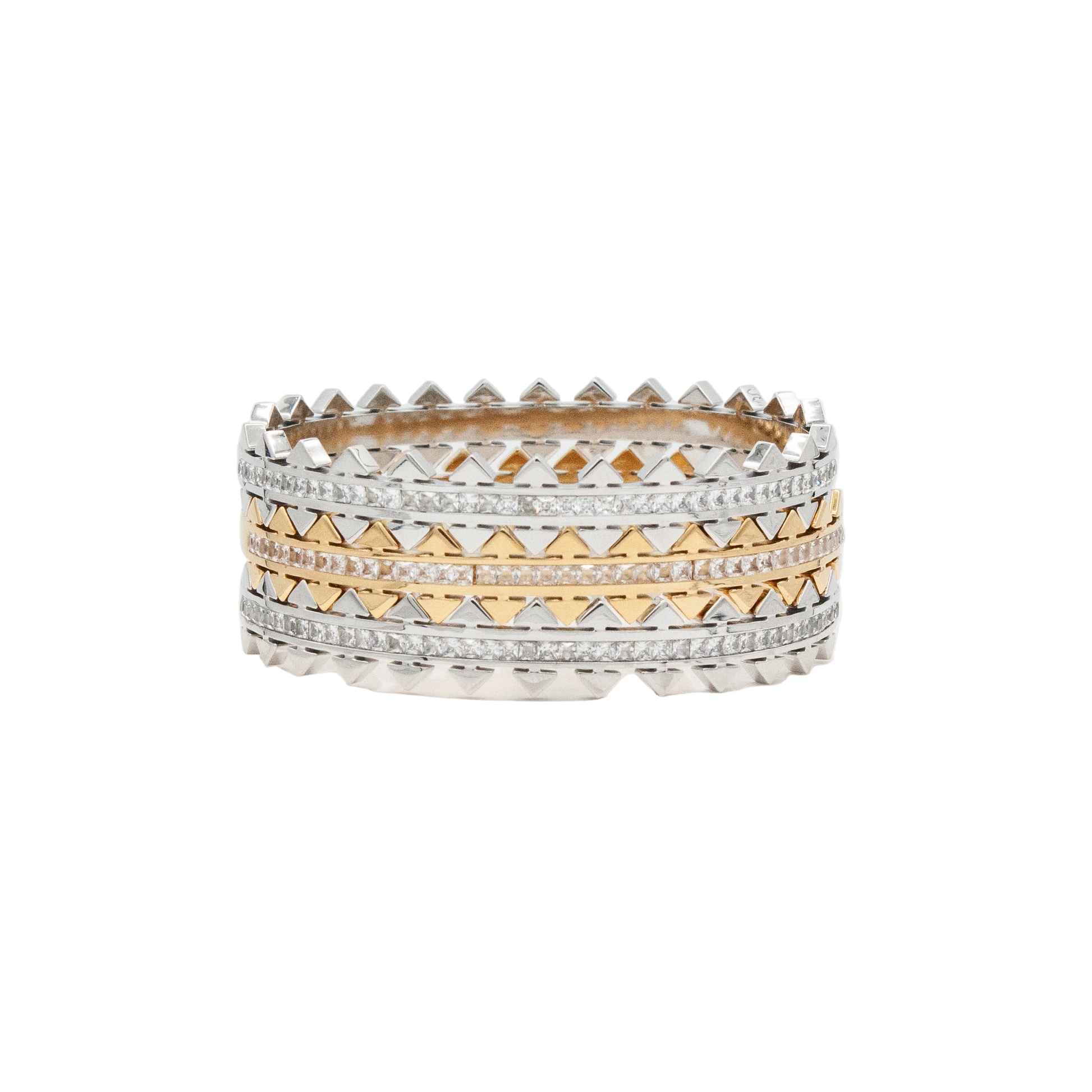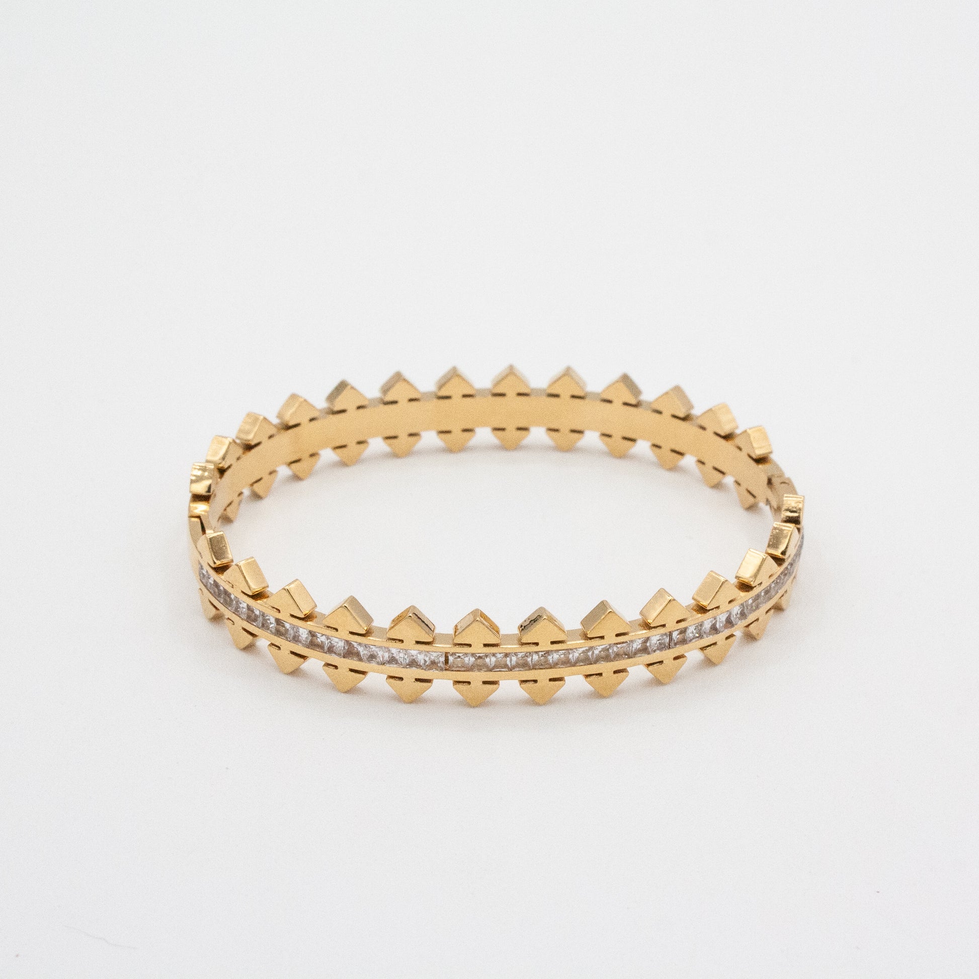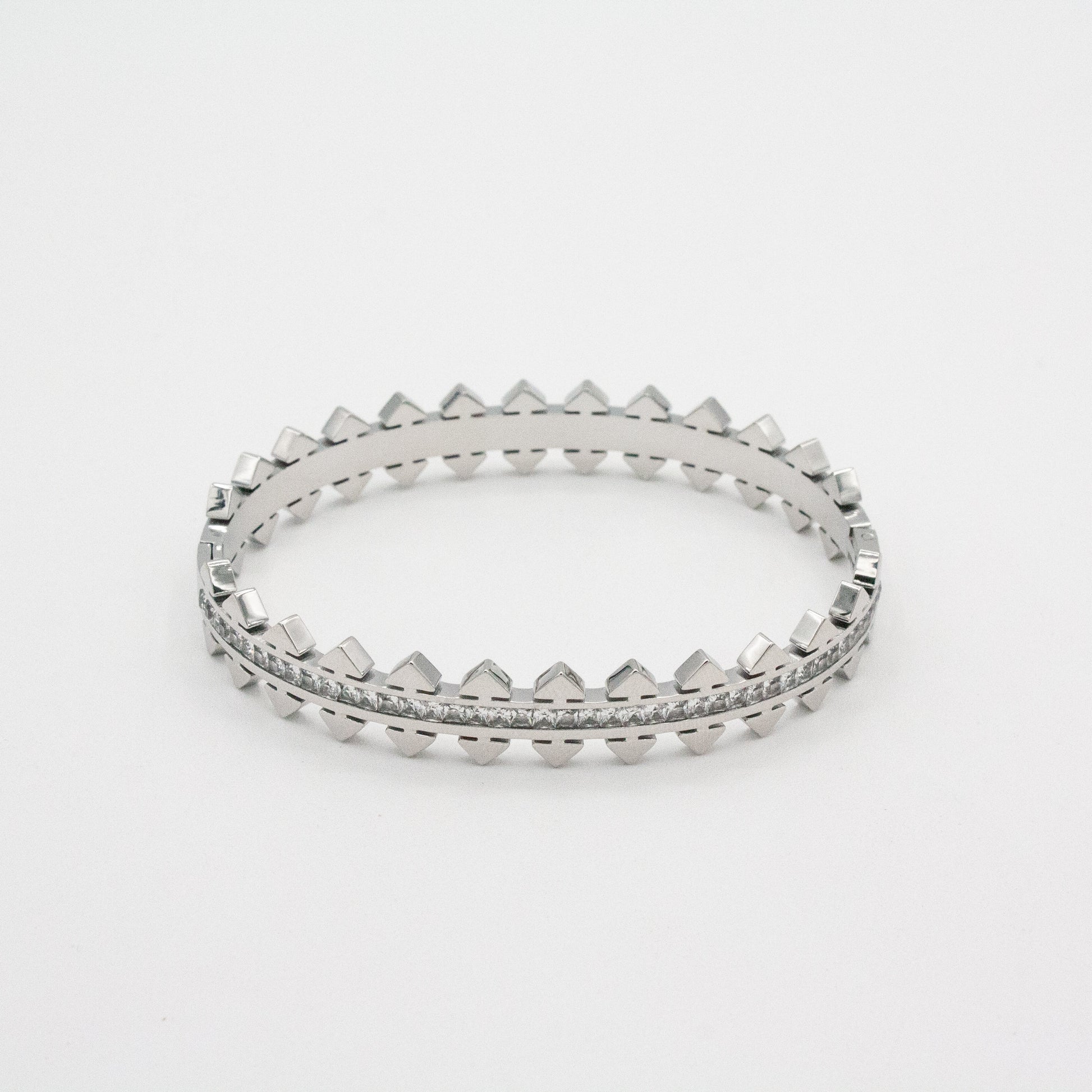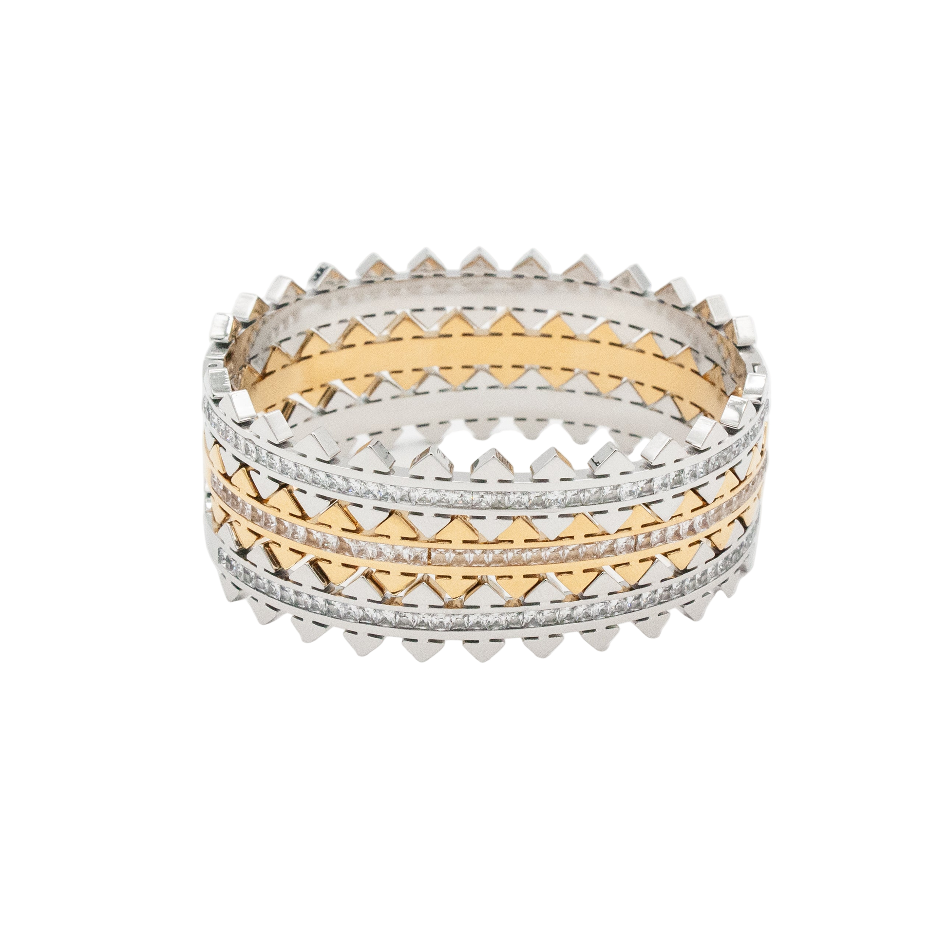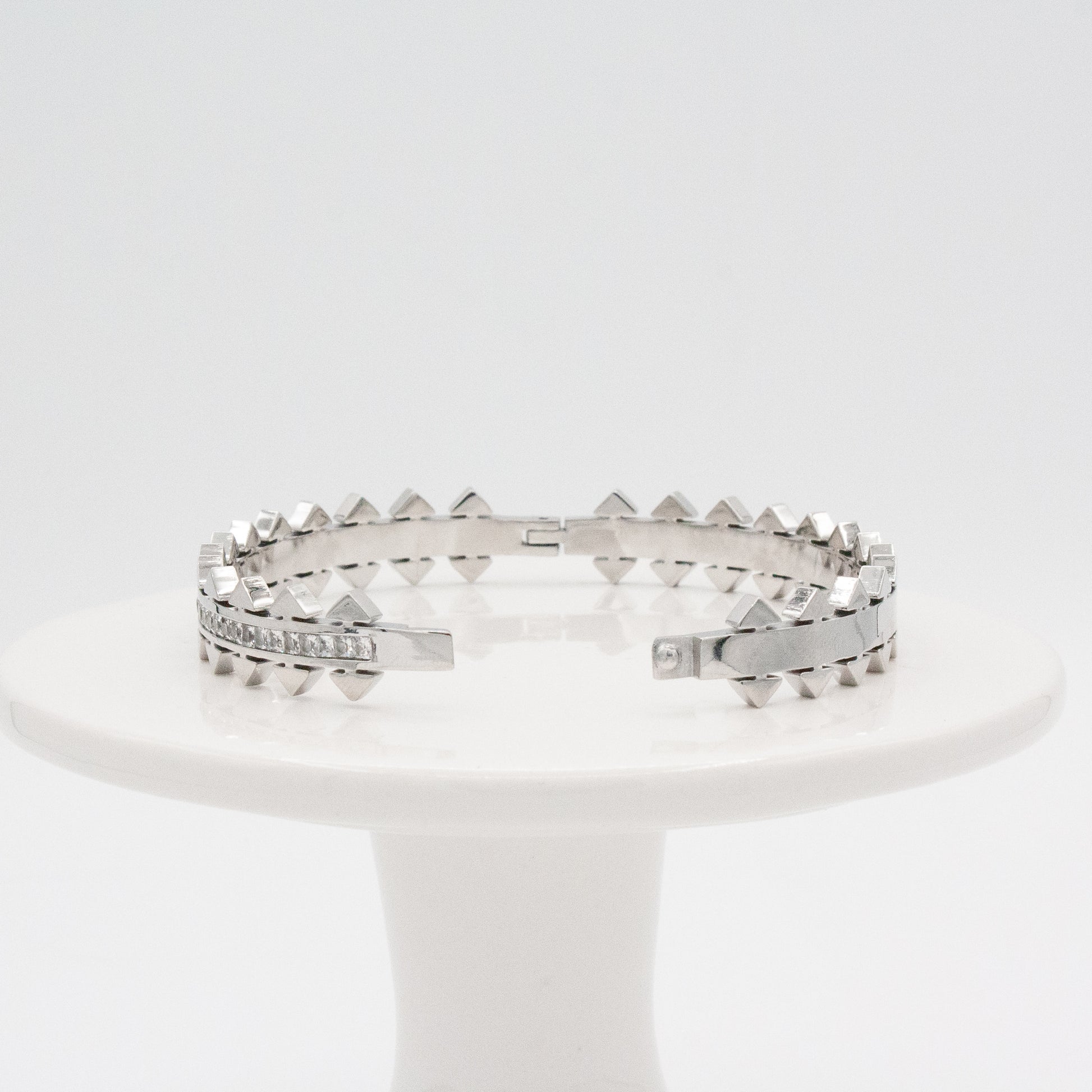 Bold meets effortless luxury. The Monaco Stacker Bracelets spiked detailing and hand-set crystals catch the light like sunset on water. Designed with a sleek hinge and magnetic closure for effortless wear - just press gently on one side to open. One side shimmers with CZ detail, while the other shines in smooth gold or silver, giving you two looks in one. Made to stack, shine and turn every moment into golden hour.