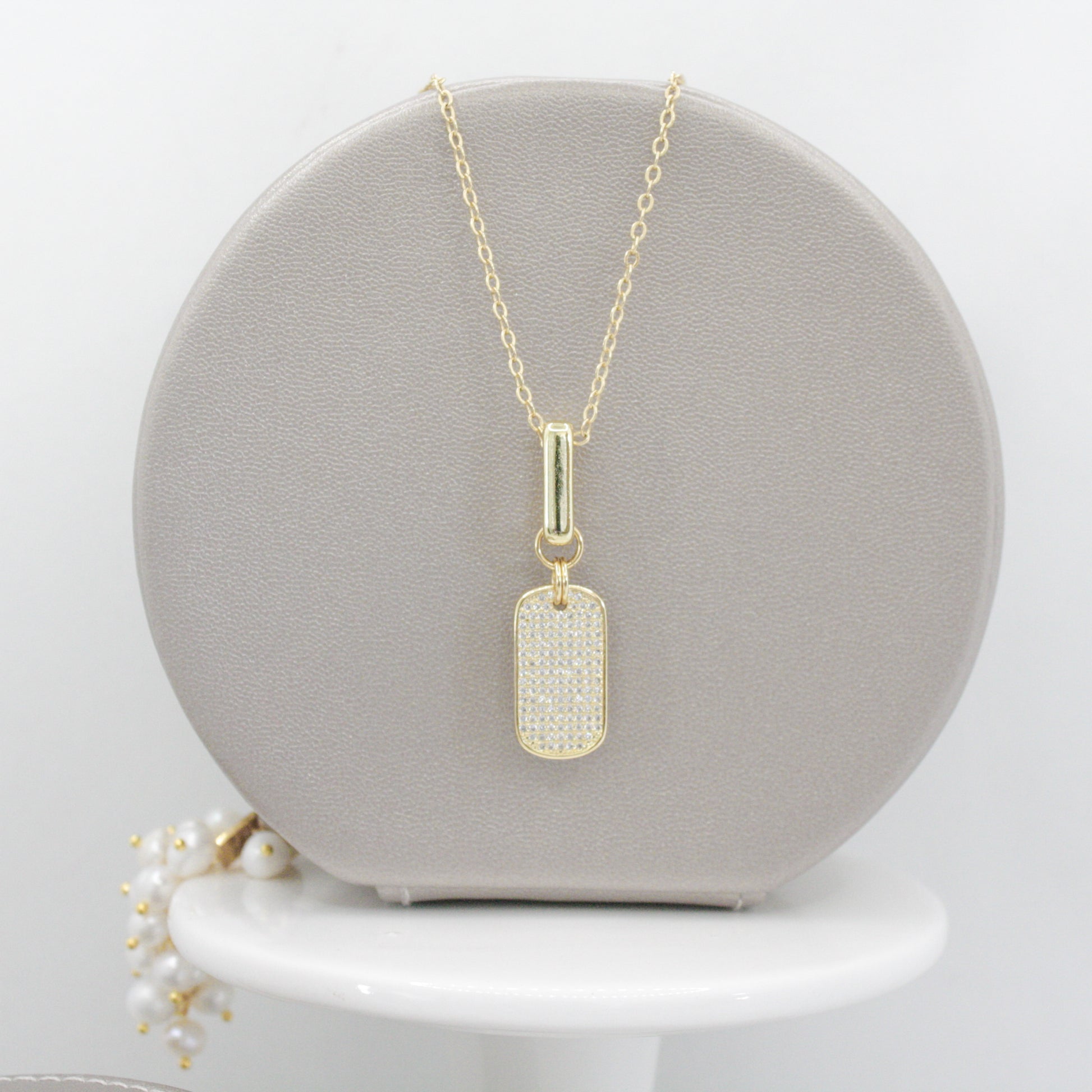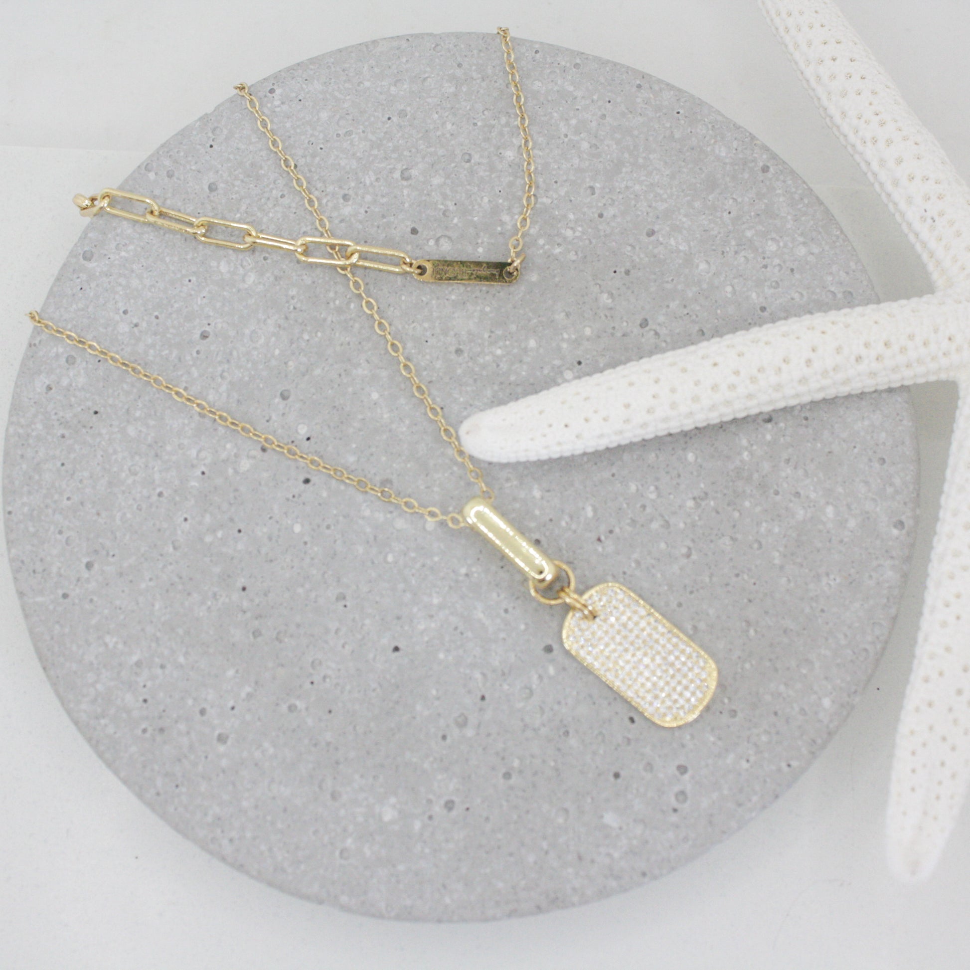 Sharp, modern, and luminous. The 24k gold-filled military tag catches the light with sparkling CZ, a bold layering piece that balances edge and elegance - perfect for elevating sun-soaked evenings or everyday moments with effortless polish.