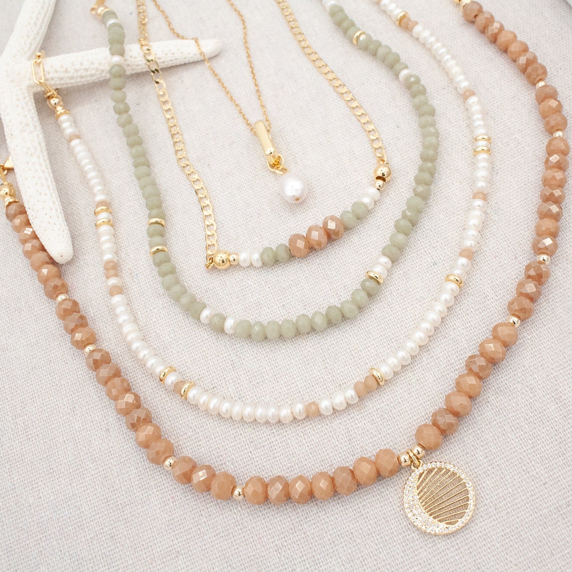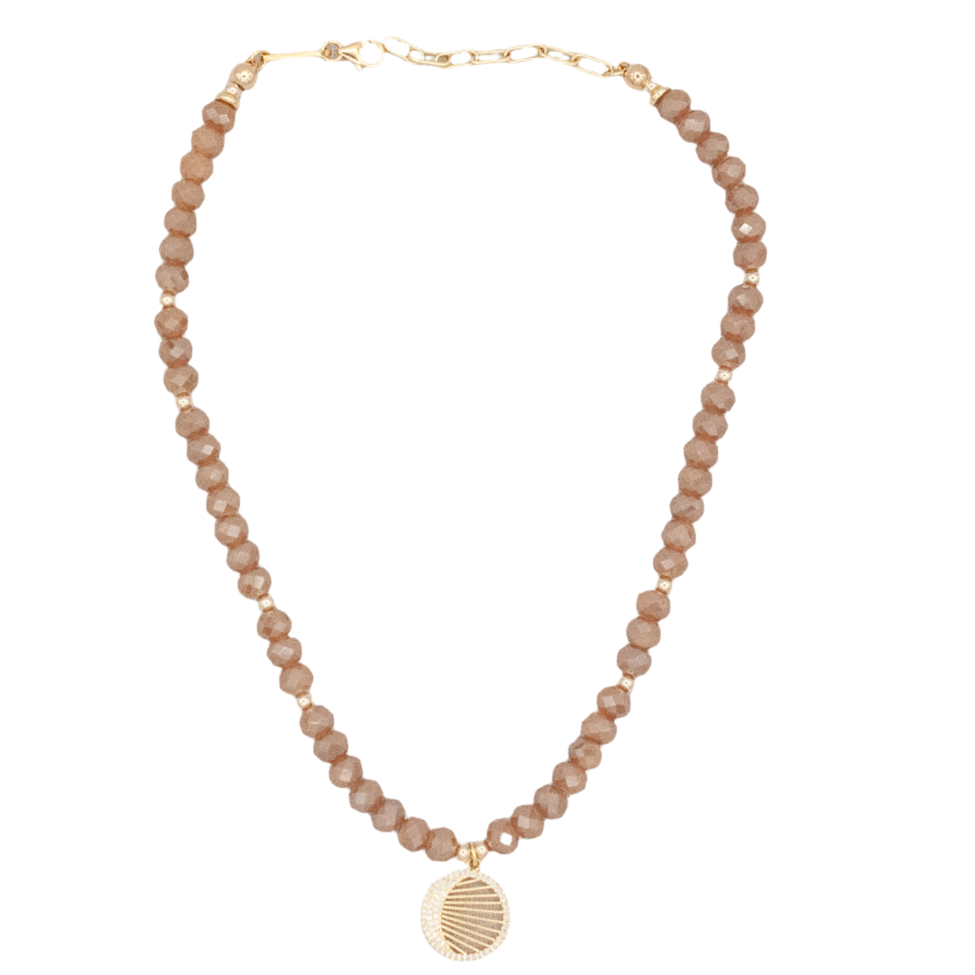 Capture the essence of summer with our terracotta-colored beaded Rai Necklace featuring a delicate CZ sun rays circle pendant in gold-filled setting. This elegant accessory adds a touch of beach-inspired charm to any outfit, making it perfect for resort-style relaxation or leisurely walks along the shore.